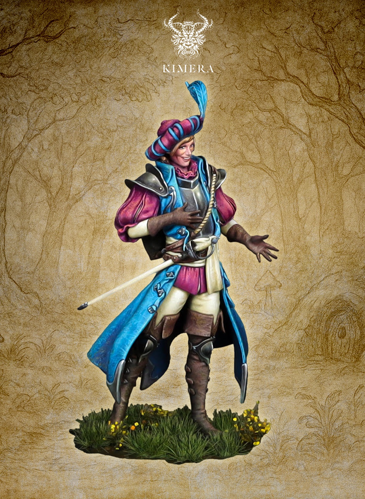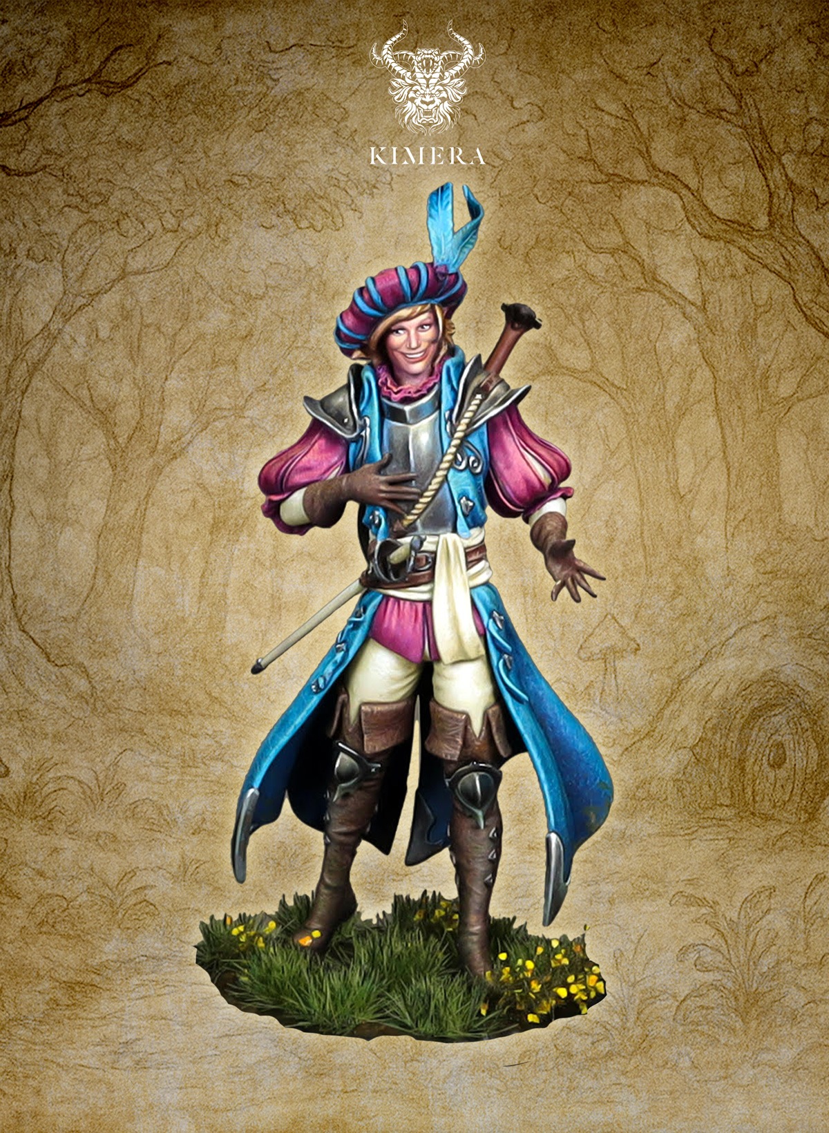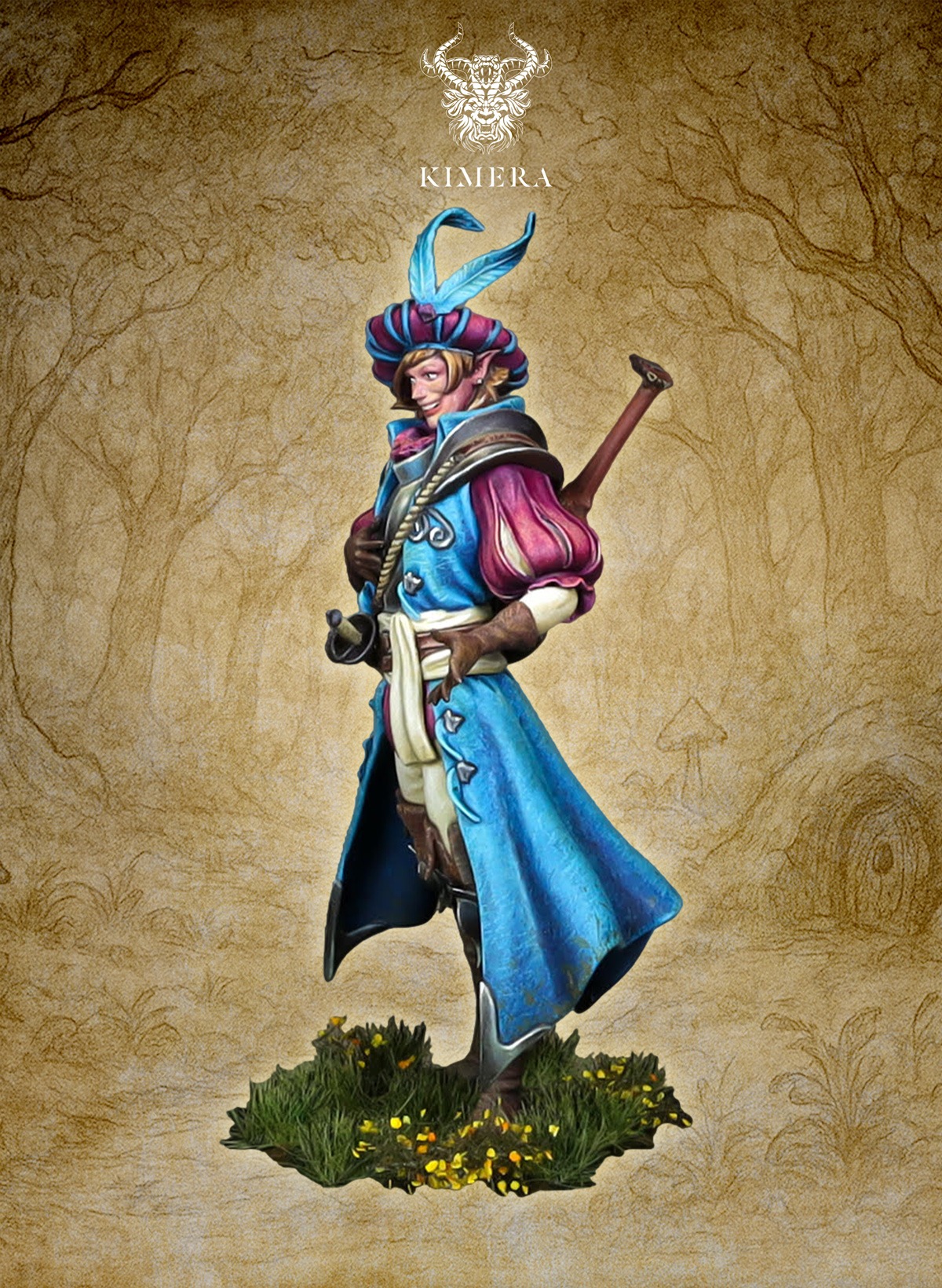 This fantasy bard miniature brings personality and movement into the Fairy Academy universe, embodying the playful, unpredictable charm typical of the Wood Whisperers line. The sculpt captures a charismatic figure frozen mid-gesture, with expressive features, layered clothing, and a long feathered hat that reinforces the whimsical identity of this character. Every fold, button, and ornament is intentionally exaggerated to align with the colourful, surreal tone of the Fairy Academy aesthetic.