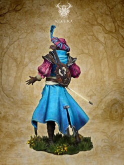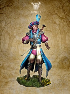 The bard’s pose is relaxed yet dynamic, suggesting a storyteller who thrives on attention and thrives even more on mystery. Whether interpreted as a travelling performer, a magical envoy, or a mischievous academy figure, this fantasy bard miniature offers painters multiple opportunities for creative direction. The wide coat panels, contrasted fabrics, and exposed armour sections allow for experimentation with textures, light reflections, and saturated colour palettes.